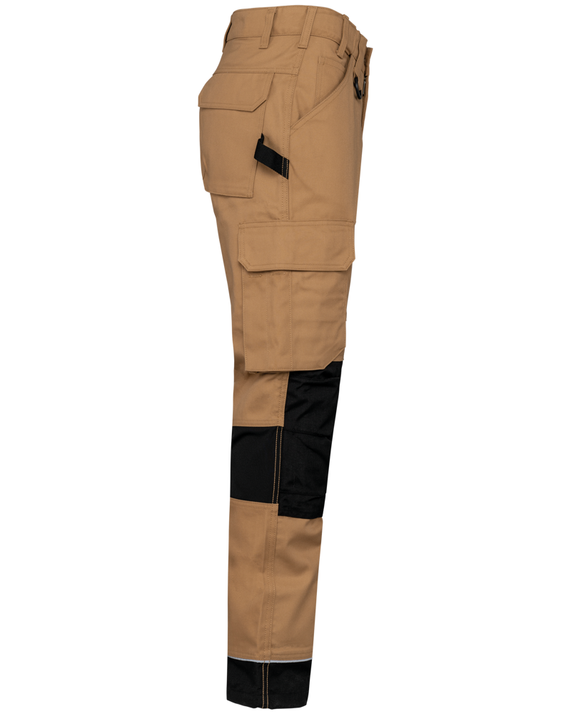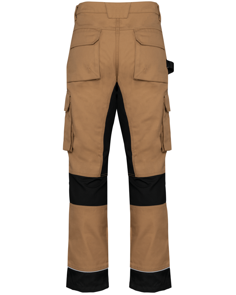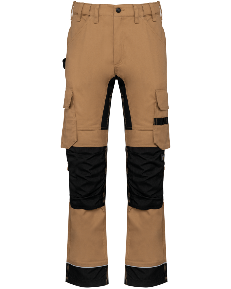60% katoen / 40% gerecycleerd polyester. Wasbaar op 60 °C. Rechte snit. 2 zakken aan de voorkant (binnenzakken in de hoofdstof), waarvan 1 met ticketzak. 2 losse cargozakken met ruimteplooi en klep met klittenbandsluiting, waarvan één met 2 vakken en plaats voor gereedschap. Pennenzakje rechts (bij het dragen). 2 achterzakken met ruimteplooi en klep met klittenbandsluiting. Hamerlus links (bij het dragen). Schuimrubber in een zak op de knie in contrasterend Cordura® (zwart voor alle kleuren). Rekbaar en contrasterend (behalve voor zwart) inzetsel tussen de benen en achteraan de knieën, voor extra stevigheid en bewegingsvrijheid. Inzetsel onderaan de broekspijpen in Cordura®, met silver biesje en een verstelbare zoom van 5 cm. Drievoudig stiksel in het kruis voor- en achteraan. Dubbel stiksel opzij en tussen de benen. Riem met plastic gesp + lussen die verstelbaar zijn dankzij een elastiek. Brede lus op de achterkant van de tailleband. Ritssluiting met knoop (metalen knoop bekleed met plastic). Afneembaar merklabel. Wordt verkocht zonder accessoires. Compatibel met WKI0306: afneembare gereedschapstassen.