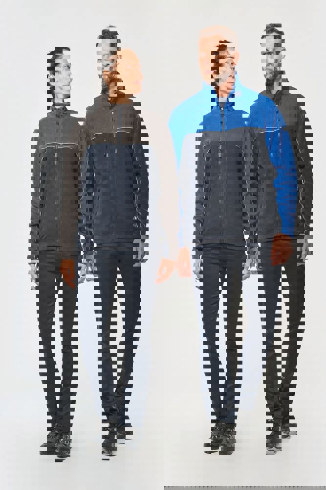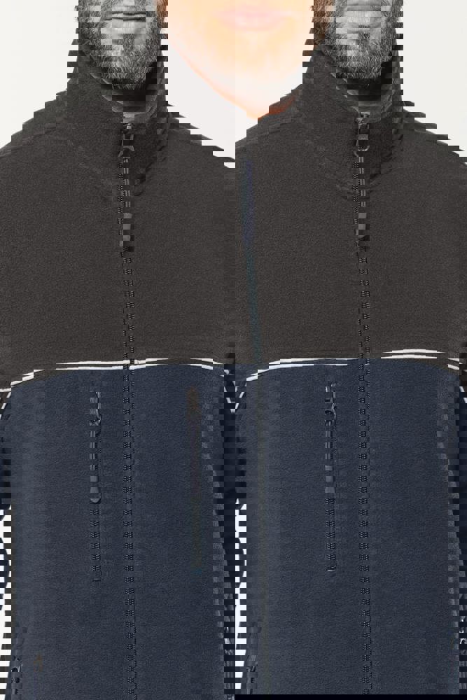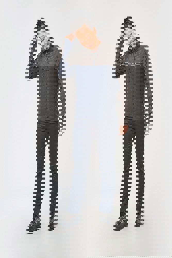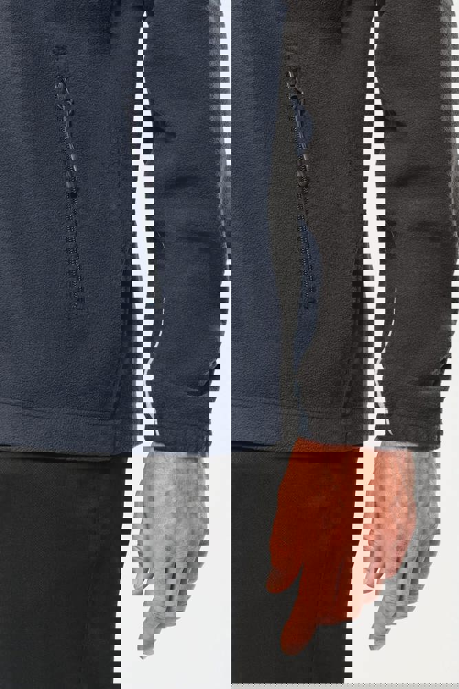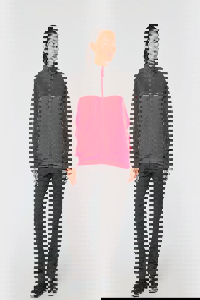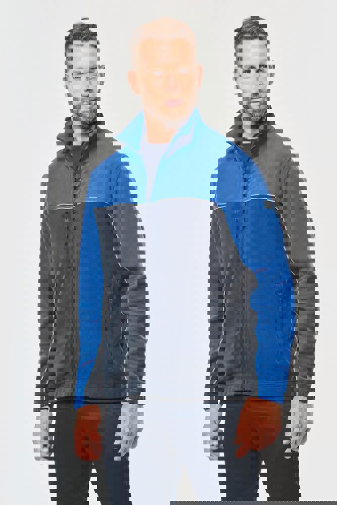 100% polyester. Gemaakt van 100% gerecycleerd polyester. Anti-pluis microfleece. Rechte snit. 2 ritszakken opzij + 1 borstzakje met rits Gerecycleerde toon-op-toon plastic ritsen met ritstrekker. Contrasterende nektape met visgraatmotief. Contrasterende bies tussen de tweekleurige delen van het kledingstuk (lichaam, voorkant mouwen en rug). Elastische penhouder met 3 vakken op de linkermouw. Ophanglint in de kraag. Elastische mouwuiteinden en boord. Tear-away merklabel.