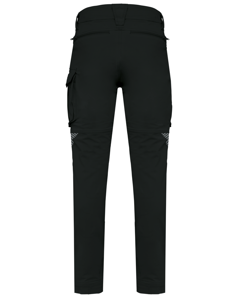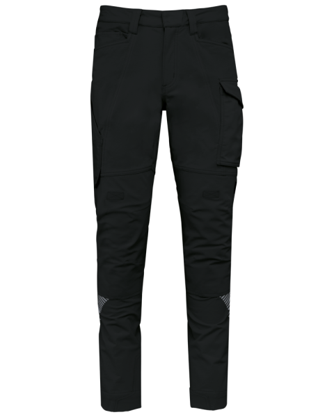68% gerecycled polyamide / 22% katoen / 10% elastaan. Stretch dobby stof. Wassen op 40°C. 2 voorzakken. 1 ticketzakje aan de rechterkant bij het dragen. 1 cargozak met zijvouw en klittenbandsluiting + 1 opgezette zak in versterkte stof aan de linkerkant bij het dragen. 1 duimstokzak + 1 opgestikte zak in versterkte stof met 2 gereedschapshouders aan de rechterkant bij het dragen. 2 kniebeschermerzakken in ton-sur-ton stretch Cordura® 92% polyamide, 8% elastaan (kniebeschermers niet meegeleverd) met klittenbandsluiting en binnenflap om de kniebeschermer op zijn plaats te houden. 2 achterzakken met rits. Binnenbeen verstevigd met ton sur ton Cordura® stretch. Reflecterende details op voor- en achterkant been. Tailleband met riemlussen, waarvan 1 breed en versterkt in het midden van de rug. Verstelbare tailleband met elastiek aan de binnenkant van de rug. Ritssluiting en plastic knoop verborgen door versterkte stof. Drievoudige naden aan kruis, zijkanten en kruis, voor en achter. 5 cm verstelbare zoom. Certificatie procedure is lopende: PBM Klasse II. Normen NF EN ISO 13688:2013 + NF EN ISO 13688/A1:2021 (Beschermende kleding - Algemene eisen), NF EN 14404-1:2024 + NF EN 14404-3:2024: Niveau 1U alleen in combinatie met WKP150 kniebeschermers (Persoonlijke beschermingsmiddelen - Kniebeschermers voor werk op de knieën). Afneembaar merklabel.