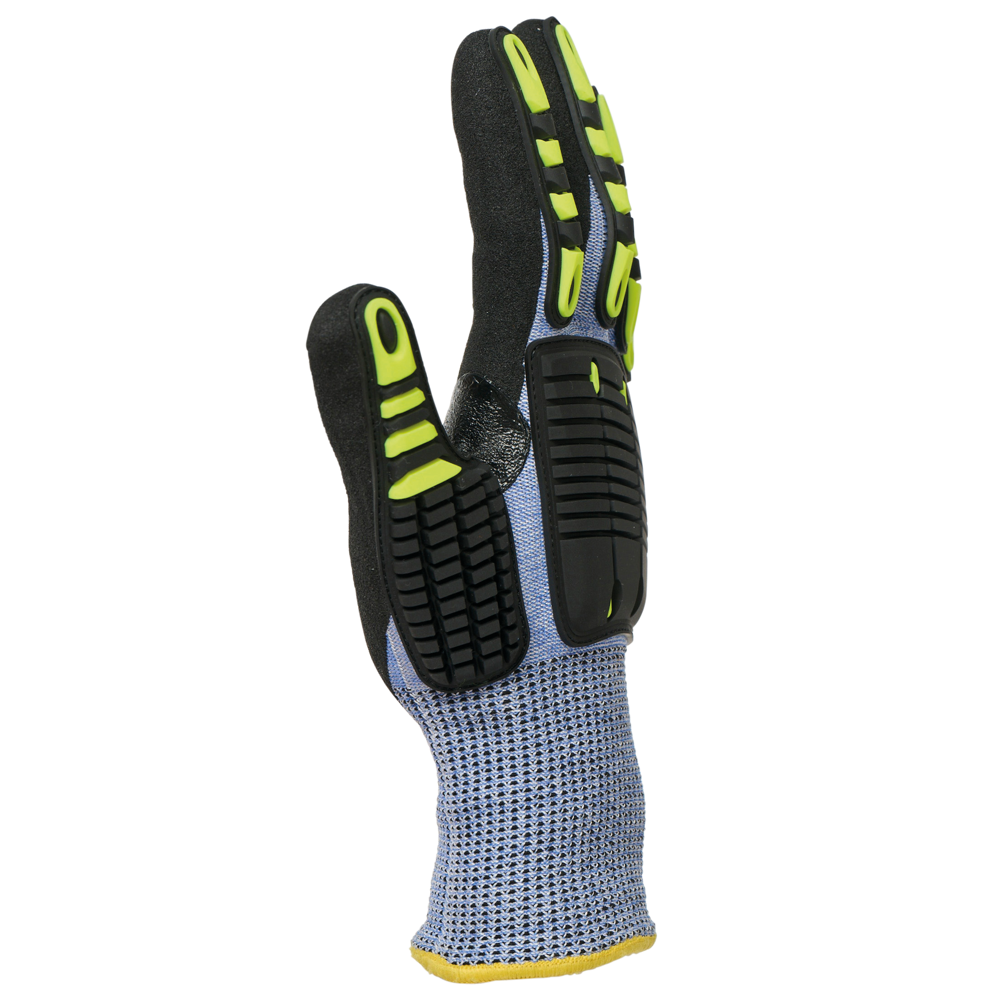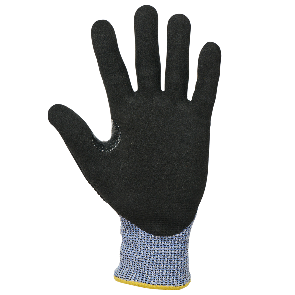 Gebreid in HPPE, staalvezel, basalt, polyester en elastaan. Gauge 13. Coating van ruw nitril op handpalm en vingers. Versteviging tussen duim en wijsvinger in ruw nitril. PVC-verstevigingen op de bovenkant van hand en vingers. Elastische polsboord met elastisch overlockstiksel in een kleur die varieert naargelang de handschoenmaat. Niet-wasbaar product. PBM Klasse II. Normen NF EN ISO 21420:2020 (Beschermende handschoenen - Algemene eisen en testmethodes), NF EN 388+A1:2018 (Beschermende handschoenen tegen mechanische risico's): prestatieniveaus 4343FP. Gewicht van een paar handschoenen in maat 10: 212 g