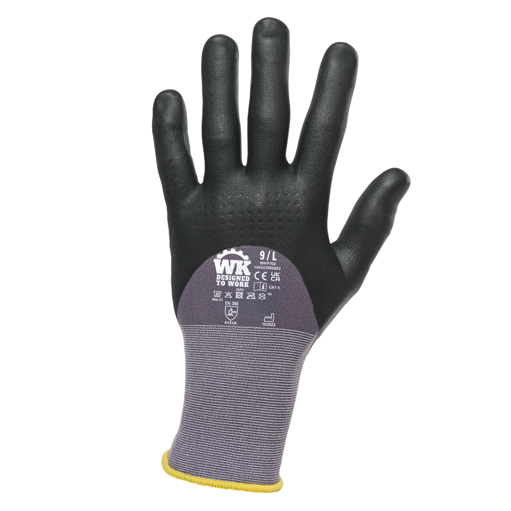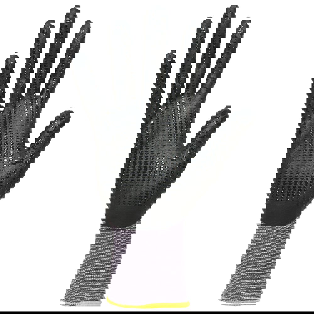 Gebreid in polyamide en elastaan. Gauge 15. Coating van micro-nitrilschuim op handpalm,, vingers en 3/4 van de rug van de hand. Noppen in nitril op de handpalm en de binnenkant van de vingers. Elastische polsboord met elastisch overlockstiksel in een kleur die varieert naargelang de handschoenmaat. Wasbaar op 40 °C op een programma voor fijne was. PBM Klasse II. Normen NF EN ISO 21420:2020 (Beschermende handschoenen - Algemene eisen en testmethodes), NF EN 388+A1:2018 (Beschermende handschoenen tegen mechanische risico's): prestatieniveaus 4131A. Gewicht van een paar handschoenen in maat 10: 48 g