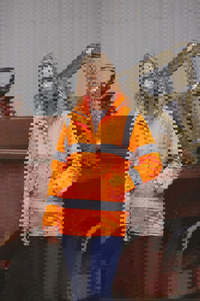 Jas in 100% polyester die wind en water buitenhoudt en ademt. Ton-sur-ton voering in mesh. Waterdichte, thermogelaste naden. In de kraag ingewerkte capuchon met klittenbandsluiting. Heel sterke ritssluiting met dubbele schuiver met een overslag met klittenbandsluiting. Zijzakken onder overslag met klittenbandsluiting met reflecterende bies. Klittenbandsluiting aan de mouwuiteinden, met gemoltonneerde binnenzijde. Borstzak binnenin rechts, voor een gsm. Getailleerde snit en semi-elastische tailleband voor een meer elegante look. Blinde drukkersrits onderaan het kledingstuk (binnenkant). Conform aan de normen EN ISO20471 van klasse 3 en EN 343:2003 + A1:2007 van klasse 3,3.