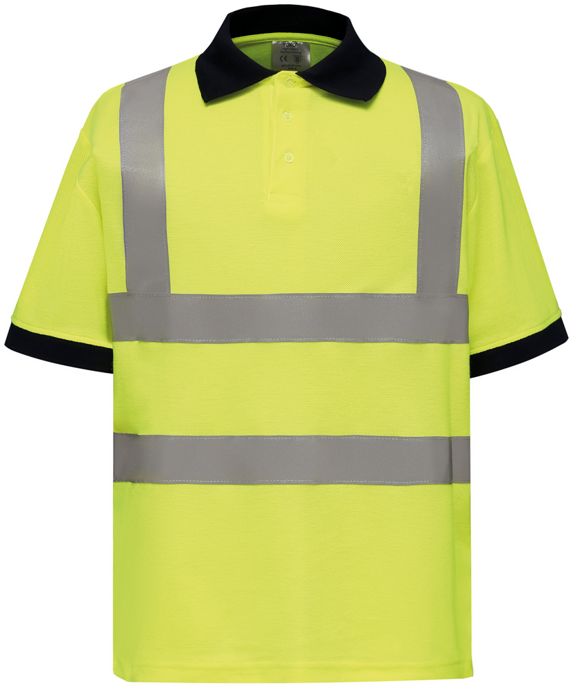100% polyester. Twee reflecterendende 3m banden van 5cm breed over het lichaam en de shouders. Kraag en mouwuitende met Navy contrast. Knooplijst met 3 knopen. Afwerking met dubbele stiksels. EN ISO20471:2013 class 2. Hi Vis Orange ook UK GO/RT 3279 railway standard conform.