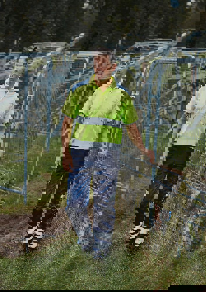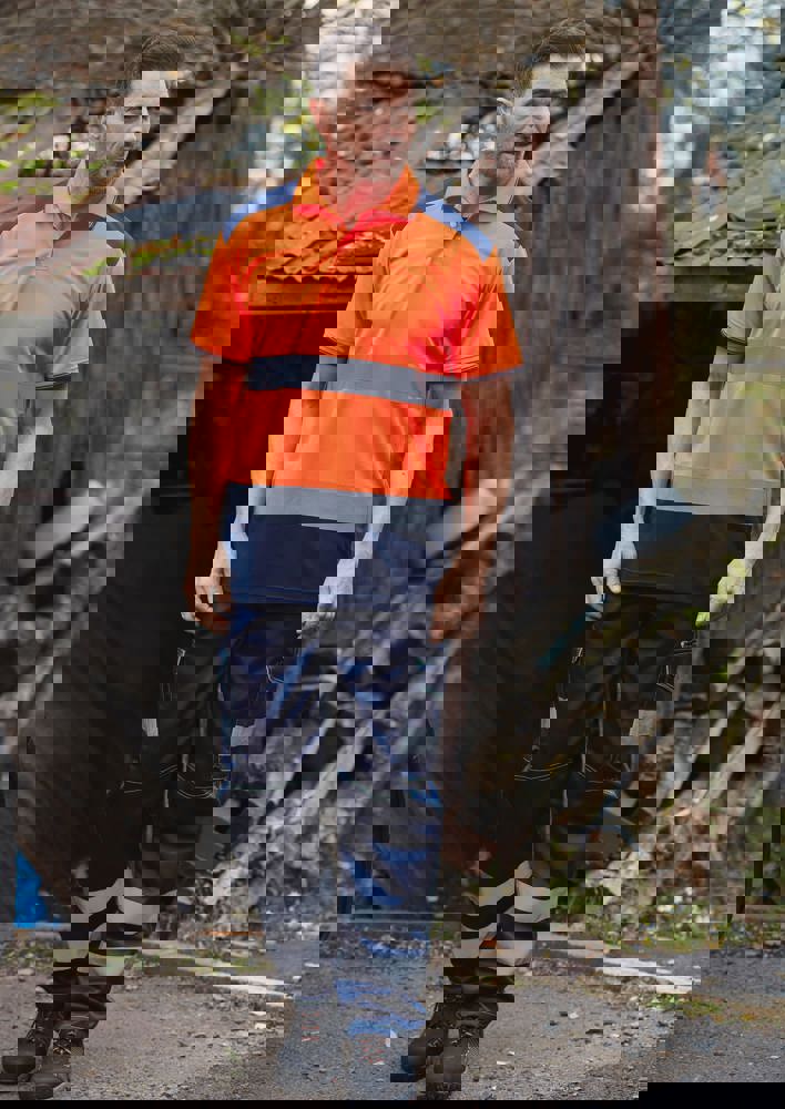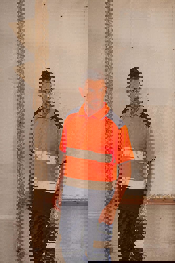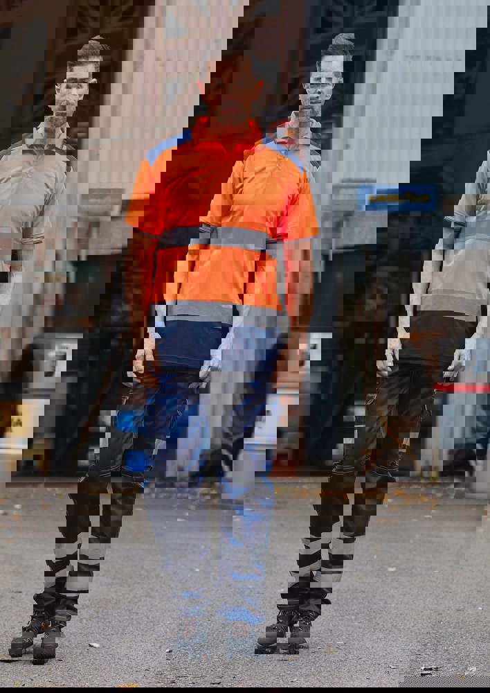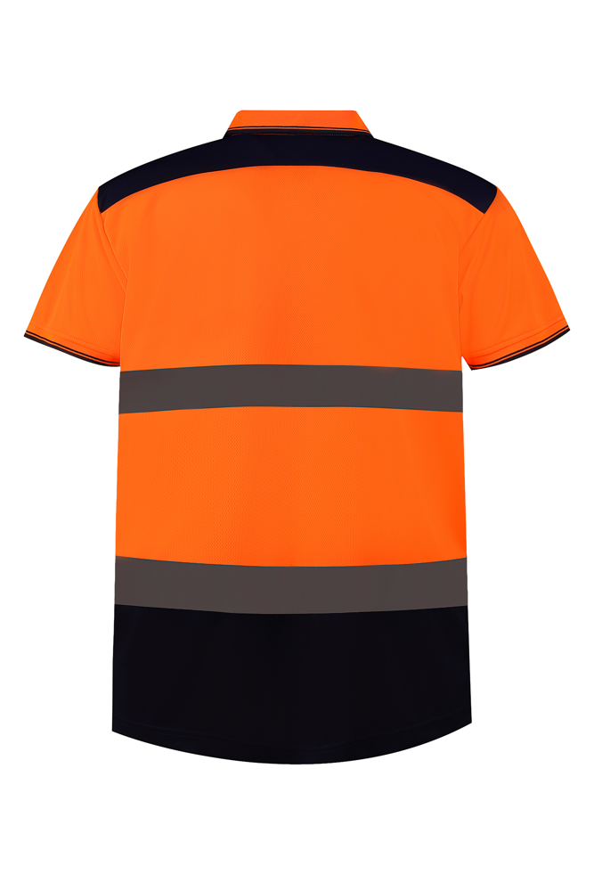 100% polyester. Twee heel brede reflecterende strepen rond het lichaam. Gemaakt van ademend, sneldrogend tricot. Grote flexibiliteit en stretch met een uitstekende vormvastheid. Mooi donkerblauw contrast op de schouders, de kraag, de manchetten en de zoom. Knooplijst met drie knopen. Zijsplitten met versterkte laspunten. Conform aan de normen EN ISO20471:2013 van klasse 2