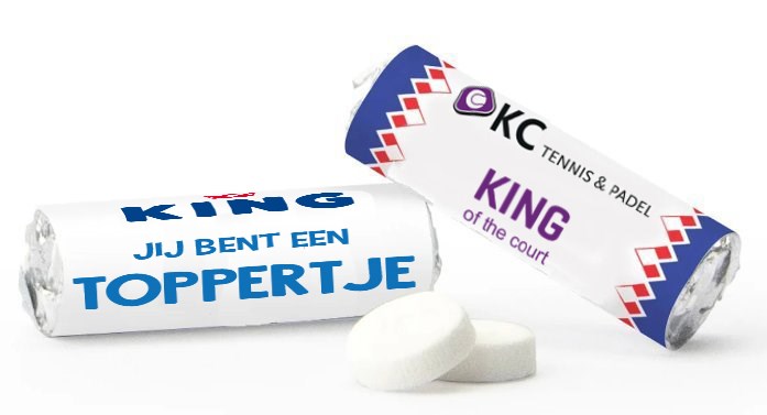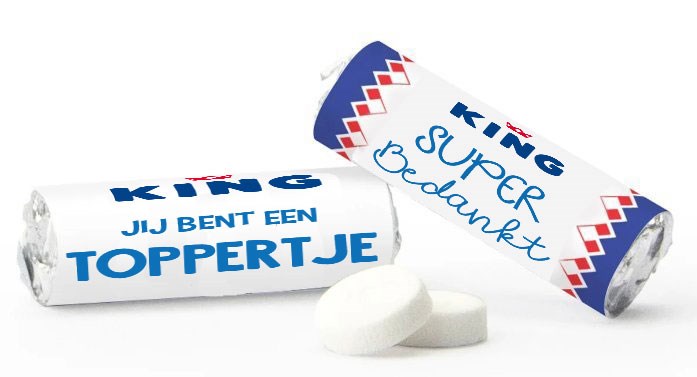 De echte mini king pepermuntjes, 9 mini king® rolletjes per rol, Met een eigen logo of tekst, en of tekst op het wikkel. Ga voor een ontwerp met het kenmerkende king randje of een geheel eigen ontwerp.
