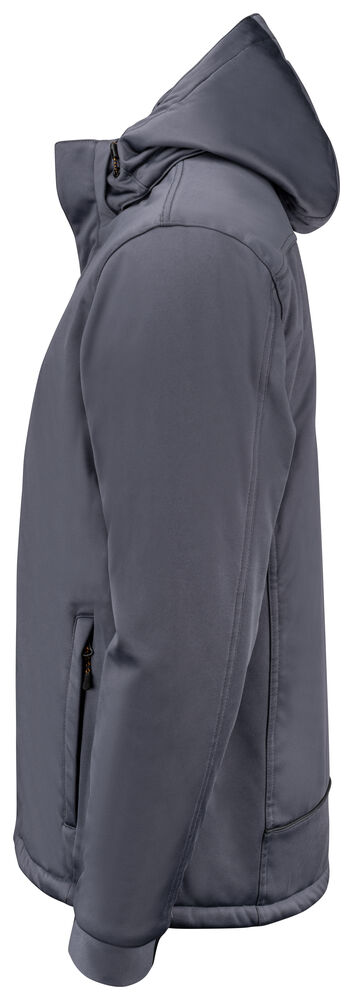 Warme, gewatteerde, lichte en comfortabele softshell jas. Afneembare capuchon met trekkoord en drukknopen. Voorzakken met verborgen ritsen. Ruime binnenzak met meshvoering voor het opbergen van handschoenen en muts. Rits in de onderzijde van het rugpand om borduurwerk mogelijk te maken. Gewatteerde voering in de body (140 g/m²) en de mouwen (120 g/m²), microfleece voering bij de schouders en een deel van de rug. De functionele meshvoering in het midden van de rug bevordert het vochttransport. De zoom van de jas is verstelbaar met een trekkoord. Subtiele reflecterende strepen aan de achterzijde van het jack zorgen voor een betere zichtbaarheid. De rits aan de voorzijde heeft een stormklep met drukknopen. De manchetten zijn deels van geribde kwaliteit en deels van shellmateriaal.