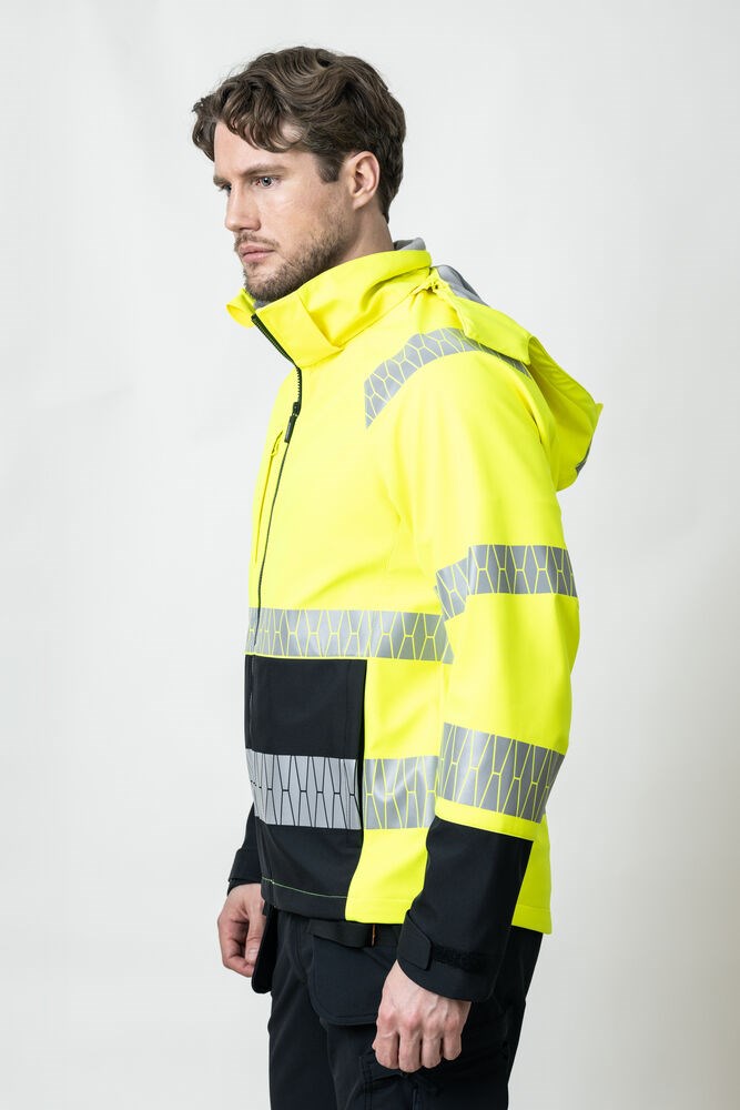 Softshell Jacket Hi-Vis met zwarte contrastvlakken. Voorzien van afneembare en verstelbare capuchon met trekkoord, voorzakken met rits en een borstzak aan de rechterkant. Voering van birdseye breiwerk voor een goed vochttransport. Delrin rits aan de voorkant met waterafstotende ritstape. Jas is verstelbaar met elastisch koord in de zoom. Afgewerkt met voorgevormde mouwen en verstelbare manchetten met klittenband. Waterkolom: 8000 mm. Ademend vermogen: 5000 g/m²/24 uur. Shellstof heeft een fluorinevrije afwerking. BIONIC-FINISH® DWR-behandeling. Oeko-tex® gecertificeerd.