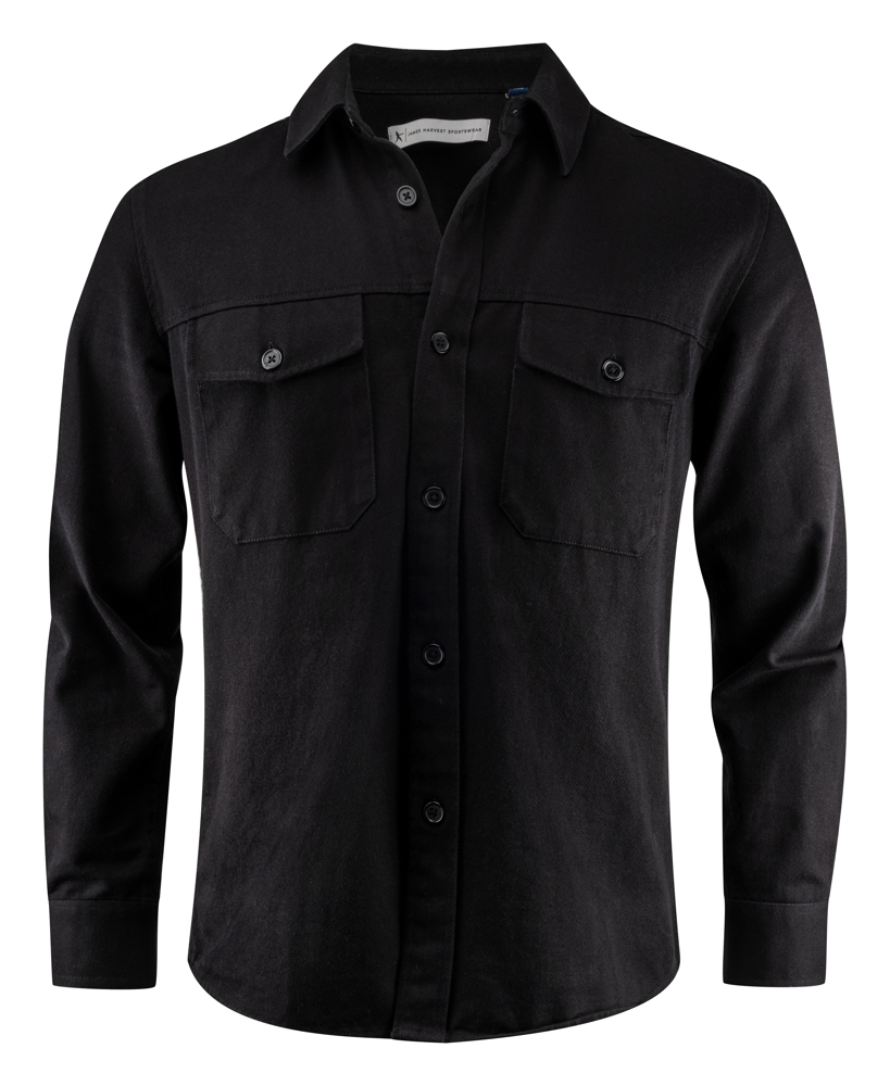Unisex hemdjas in twillkatoen met kraag, knoopsluiting en schouderpas op de rug. Borstzakken met klep en knoop. Manchetten aan de mouwen. Afgeronde zoom. Ongevoerd.