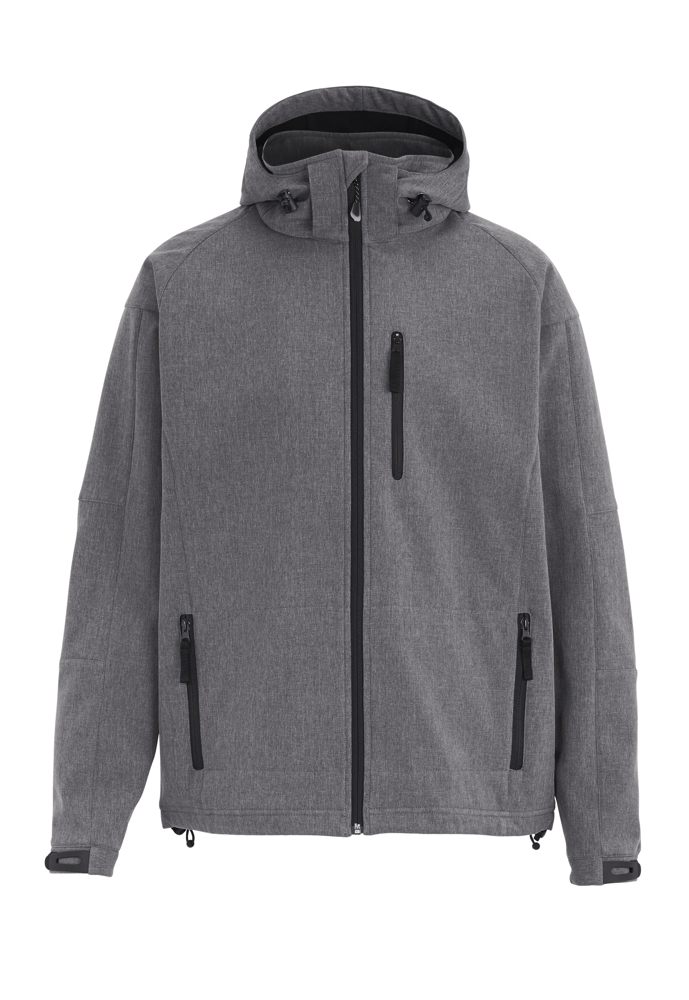 Softshell jas met contrasterende microfleece aan de binnenzijde. Wind- en waterbestendig (WP3000/MVP2000), afritsbare capuchon en manchetten verstelbaar met velcro. Elastisch trekkoord met stopper aan de capuchon en onderaan de zoom. Eén borstzak, twee zijzakken en één binnenzak.