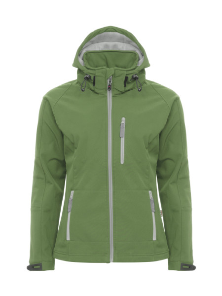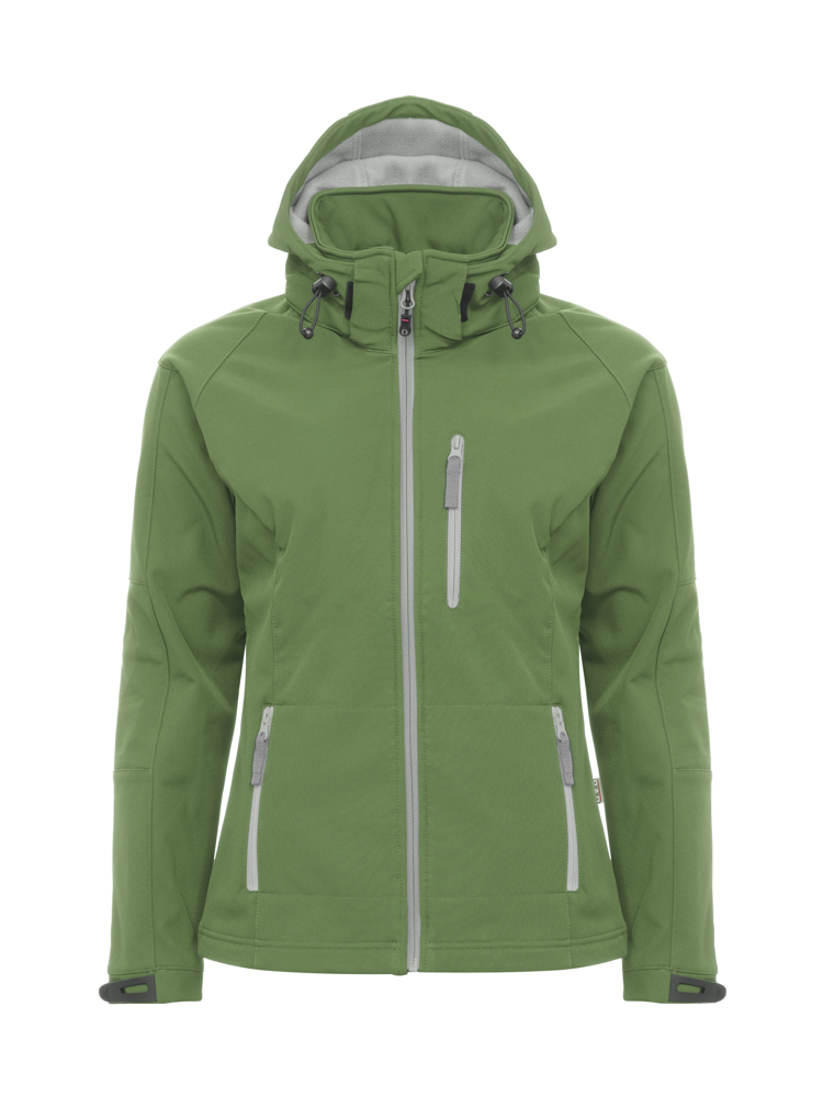 Softshell jas met contrasterende microfleece aan de binnenzijde. Wind- en waterbestendig (WP3000/MVP2000), afritsbare capuchon en manchetten verstelbaar met velcro. Elastisch trekkoord met stopper aan de capuchon en onderaan de zoom. Eén borstzak, twee zijzakken en één binnenzak.