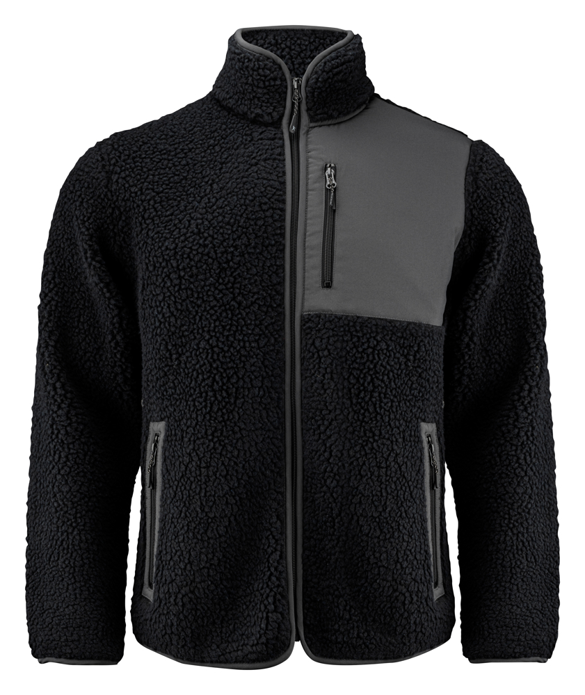Bicolor teddy fleece sweater. Contrasterende stof op de linkerborst en als afwerking van de naden. Borstzak en zijzakken met ritssluiting.