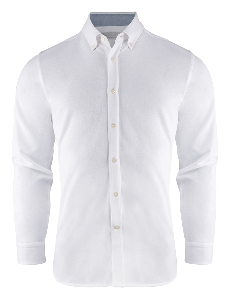 Hemd in jersey materiaal met een oxford look. Geweven details aan de binnenzijde van de kraag en zijsplitjes. De herenversie heeft een button down boord. Knopen in parelmoerkleur. Aanpasbare manchetten.
