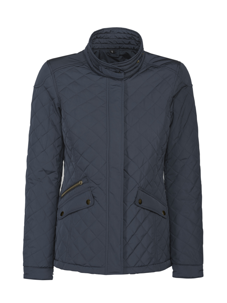 Trendy gequilte jas voor dames. Drie voorzakken en twee binnenzakken. Zacht materiaal in de twee voorzakken om de handen warm te houden. Drukknopen met embossing van het Harvest logo. Aanpasbare manchetten en stormflap over de ganse ritssluiting vooraan. Geprint label aan de binnenkant en Harvest logo op de voering.