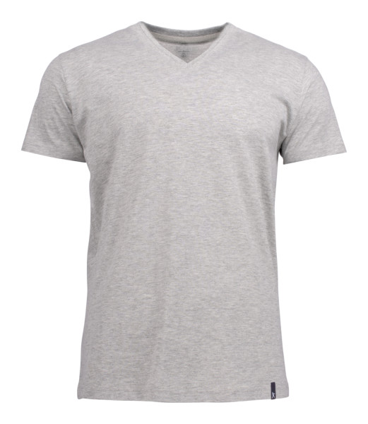 V-hals t-shirt met tweelagige ribboord aan de kraag. De stof is ringgesponnen en nabehandeld met een enzyme wash, waardoor het materiaal voorgekrompen is en zacht aanvoelt. Oeko-Tex 100 gecertificeerd.