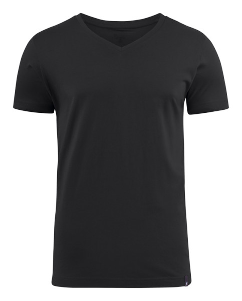 V-hals t-shirt met tweelagige ribboord aan de kraag. De stof is ringgesponnen en nabehandeld met een enzyme wash, waardoor het materiaal voorgekrompen is en zacht aanvoelt. Oeko-Tex 100 gecertificeerd.