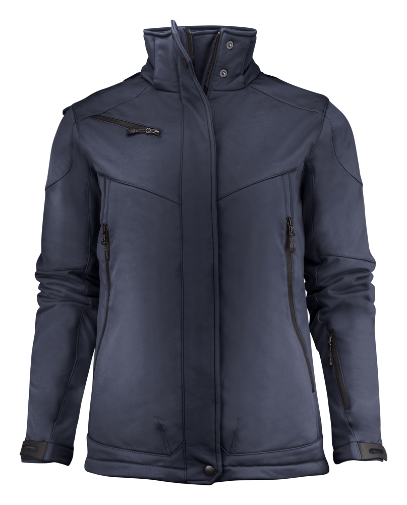 Gevoerde softshell met afneembare capuchon, voorgevormde mouwen en trekkoord onderaan de zoom. De mouwen zijn verstelbaar met een velcro. Voorzakken en borstzak met ritssluiting, twee binnenzakken met ritssluiting en een zak in membraanvoering.