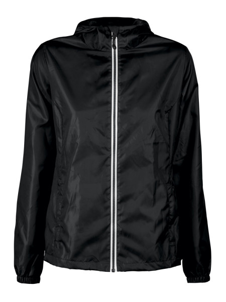 Windbreaker met capuchon voor dames in een waterafstotend materiaal aan de buitenzijde en een warme voering aan de binnenzijde. Contrasterende YKK ritssluiting.