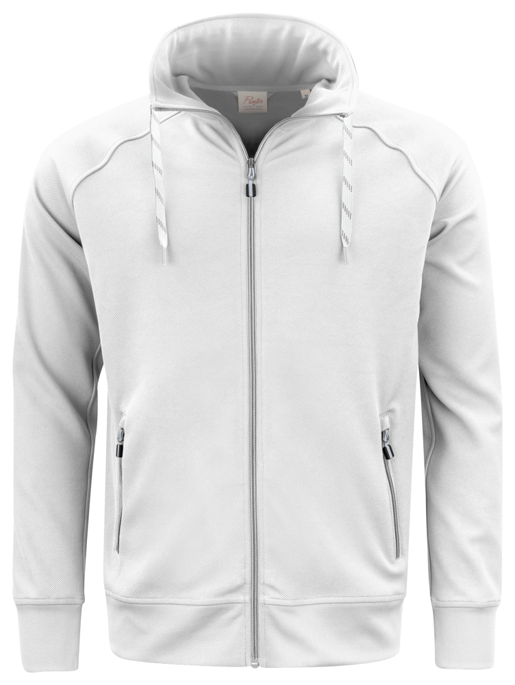 Polyester sweatshirt met raglanmouwen en een tweekleurig trekkoord. Ritssluiting vooraan en aan de zijzakken. Verborgen ritssluiting in de kraag om makkelijk het trekkoord te vervangen. De zippullers kunnen indien gewenst vervangen worden door één van de andere beschikbare kleuren, passend bij de huisstijl en/of logo van uw onderneming.