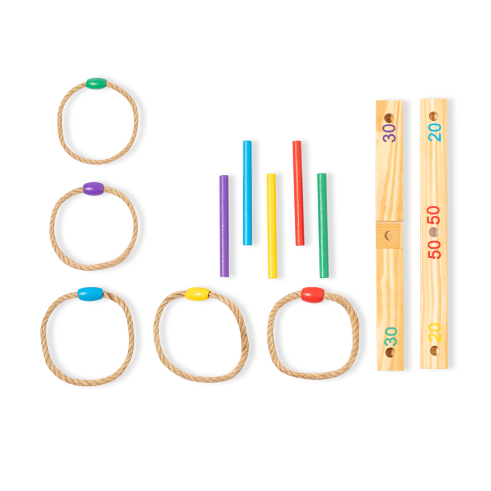 Richtspel gemaakt van hout. Hierbij worden de touwringen in de basis gestoken met stokken in dezelfde kleur (elke kleur scoort anders). Compact en eenvoudig te monteren, inclusief 12 stuks. Met instructies in het Engels en Spaans. Individueel gepresenteerd in een kraft-designdoos.