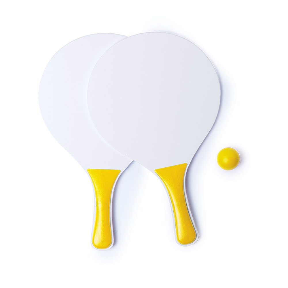 Strand Tennisracket / Beach racket in witte kleur. Het handvat is verkrijgbaar in verschillende kleuren. Geleverd in een net met bijpassende kleur bal.