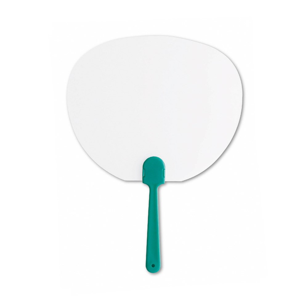 Handwaaier met witgekleurd oppervlak in doorschijnende afwerking en handvat in verschillende kleuren.
