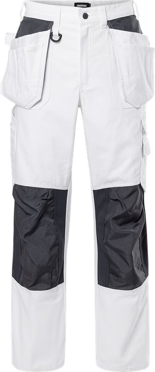 2 met CORDURA® verstevigde loshangende zakken, 1 met extra zak, 1 met 3 kleine zakken / 2 grote zakken aan de voorzijde /2 met CORDURA® verstevigde, grote zakken aan de achterzijde / D-ring / Hamerlus / Voorgevormde knieën / Met CORDURA® verstevigde kniezakken met opening aan de binnenzijde voor in hoogte verstelbare kniebeschermers / Zak met klep voor mobiele telefoon / Zak voor duimstok op de zijnaad met gereedschapshouder en pennenzakje / Beenzak met klep met extra zak met verborgen ID-pashouder / Knoop en lus voor werkmes / Goedgekeurd volgens EN 14404 samen met kniebeschermers 124292 / OEKO-TEX® gecertificeerd.