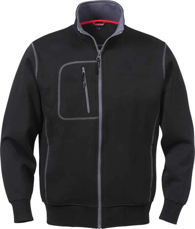 Double face doek / Ritssluiting aan de voorkant over de volledige lengte / 1 borstzak met rits / 2 voorzakken / Ribgebreide onderkant en manchetten / Flatlockstiksel.