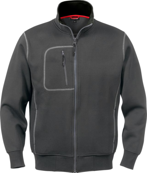 Double face doek / Ritssluiting aan de voorkant over de volledige lengte / 1 borstzak met rits / 2 voorzakken / Ribgebreide onderkant en manchetten / Flatlockstiksel.
