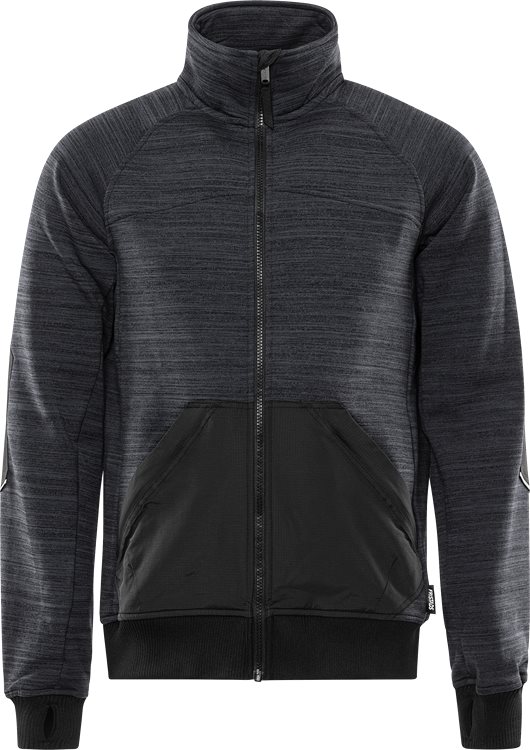 Zacht en comfortabel sweatshirtjack van gemêleerde stof, met verstevigingen op blootgestelde gedeelten en reflecterende details op mouwen en rug. Voorzakken met ritssluiting.