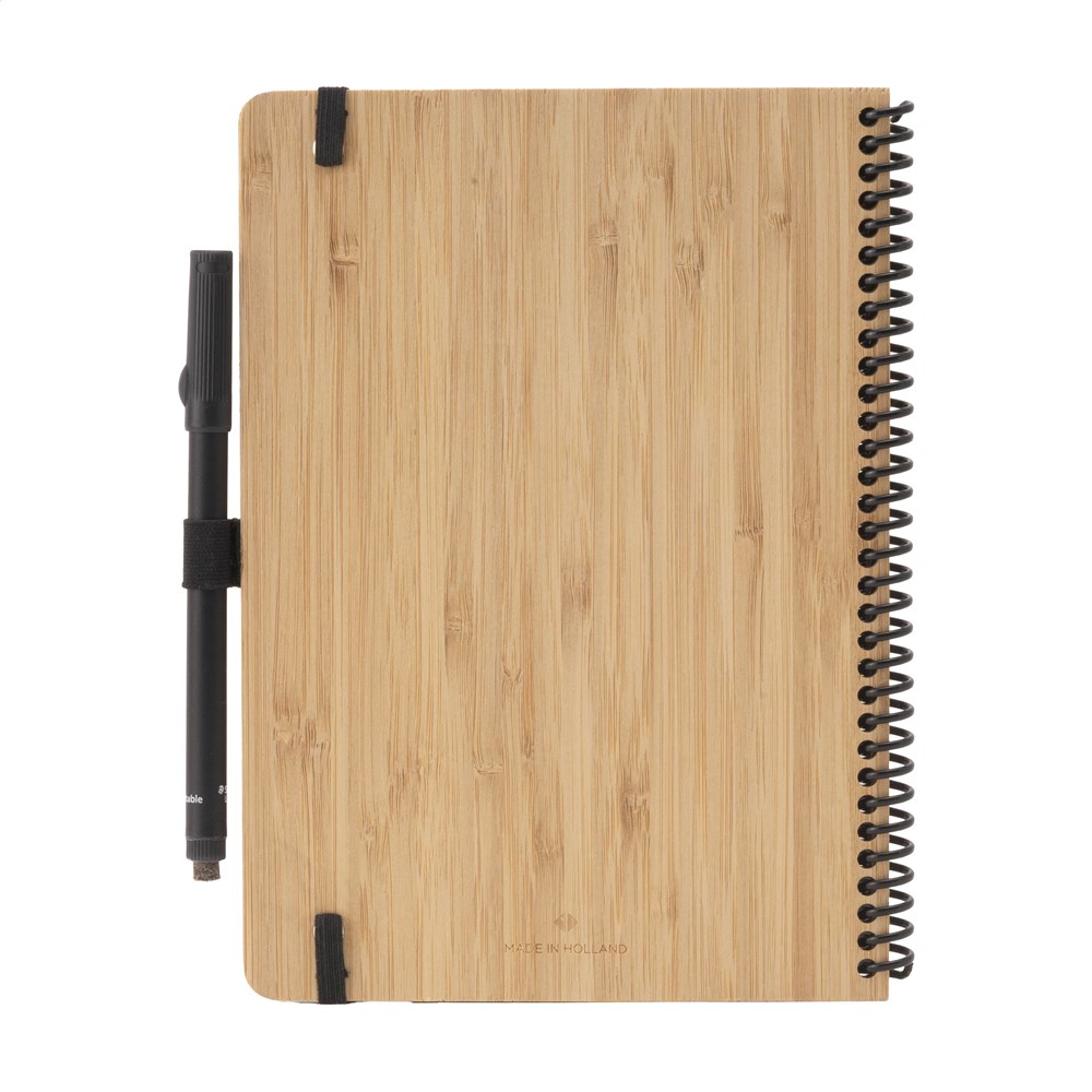 Bambook Classic Hardcover uitwisbaar notitieboek in A5-formaat. Met stevige bamboe hardcover en 20 vel/40 pagina's uitwisbaar, gelinieerd papier voor het maken van aantekeningen. Schrijf met de speciale marker op de whiteboard pagina's, scan je aantekeningen met de Bambook app en wis je pagina's, met een vochtig doekje, schoon voor hergebruik. Met wire-o-binding, penlus en sluitelastiek. Inclusief pen met gum. Het notitieboek is met de hand gemaakt. Made in Holland.