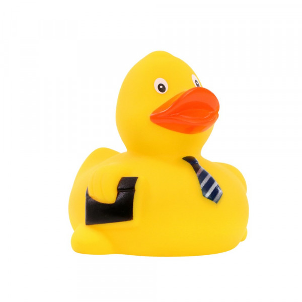 Deze eend met stropdas en koffertje maakt in elke badkuip een serieuze indruk en heeft, ook bij een nog zo relaxed bad, altijd alleen maar het werk in het hoofd. IJverig en consciëntieus vervult ons piepeendbedrijf elke taak.