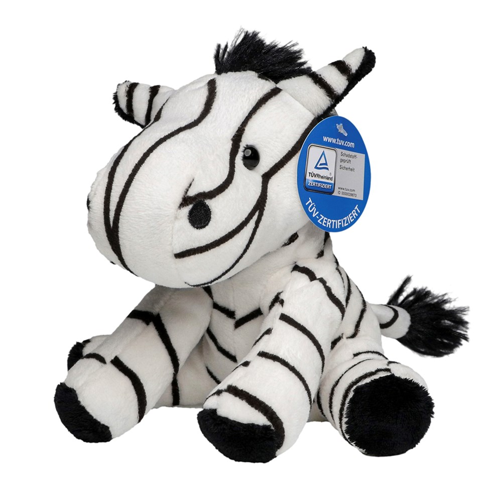 Zora, onze zittende zebra (dankzij de zwaardere pop en de zwaardere voorpoten), kun je je ook voorstellen hoe ze door de savanne galoppeert - als je het goed doet is het echt een echte zebra: zwart wit gestreept, grote zwarte kulleraugen en staande manen en staart is uiteraard ook geen paardenras, maar behoorlijk zebratypisch. De staart en manen verschillen van de rest van de vacht: zwart-witte strepen in perfecte harmonie op kort pluche en wilde zwarte manen.