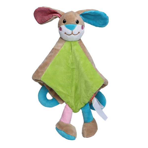 De verschillende materialen van de lange hazenoren nodigen uit tot kleine handjes om vast te pakken. Het vriendelijke geborduurde gezichtje en de kleurrijke kleuren toveren een glimlach bij de kleine op het gezichtje. Het superpluizige knuffelkonijn heeft alles in huis voor de favoriete caster.