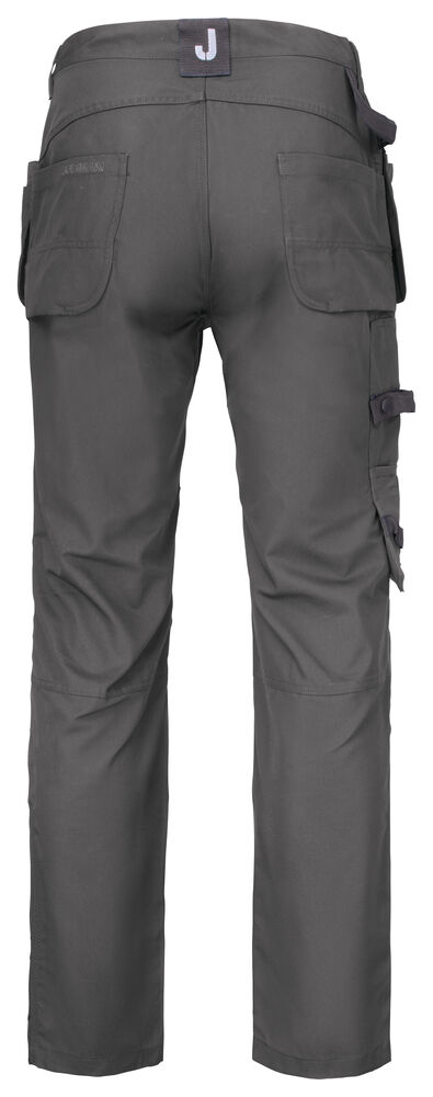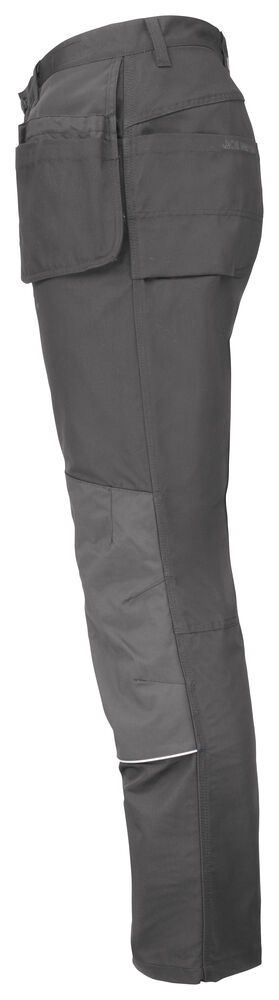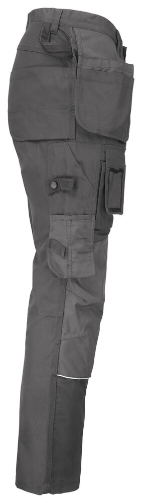 Functionele servicebroek met ruime holsterzakken, steekzakken aan de voorzijde, verstevigde achterzakken, een duimstokzak met mes-bevestigingsknoop en een zak op het been met rits, telefoonzak en ruimte voor een ID-kaart. De broek is professioneel afgewerkt met een hamerlus, extra riemlussen bij de grotere maten en rubber knopen om krassen te voorkomen. De voorgevormde knieën zorgen voor een optimaal draagcomfort. Verder zijn de zakken voor de kniestukken gemaakt van duurzaam polyamide met een reflecterende bies voor extra zichtbaarheid. Kniestukken kunnen op twee hoogtes geplaatst worden voor optimale bescherming.