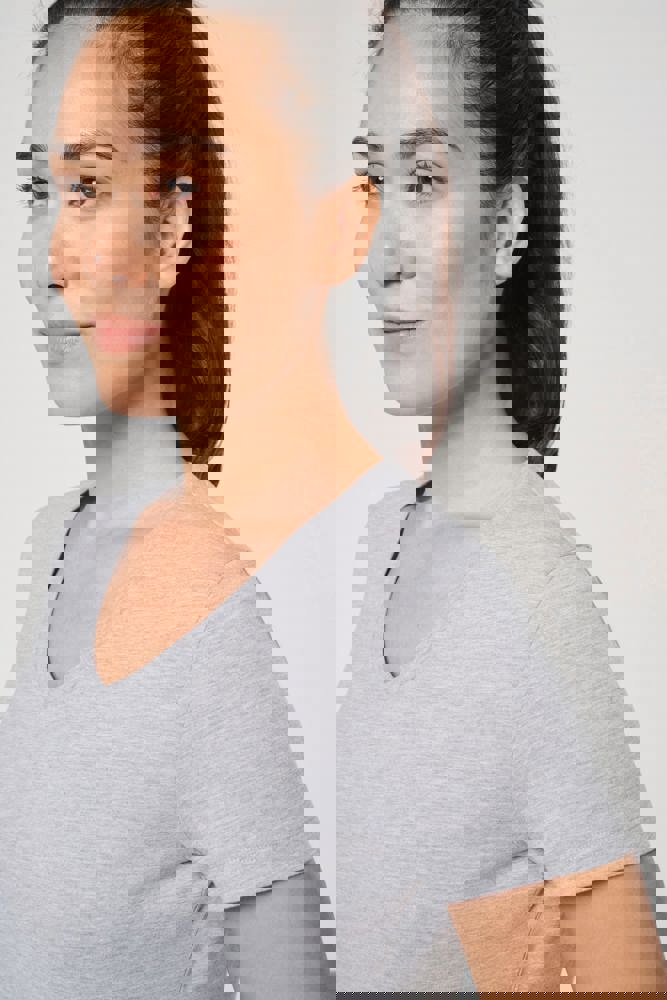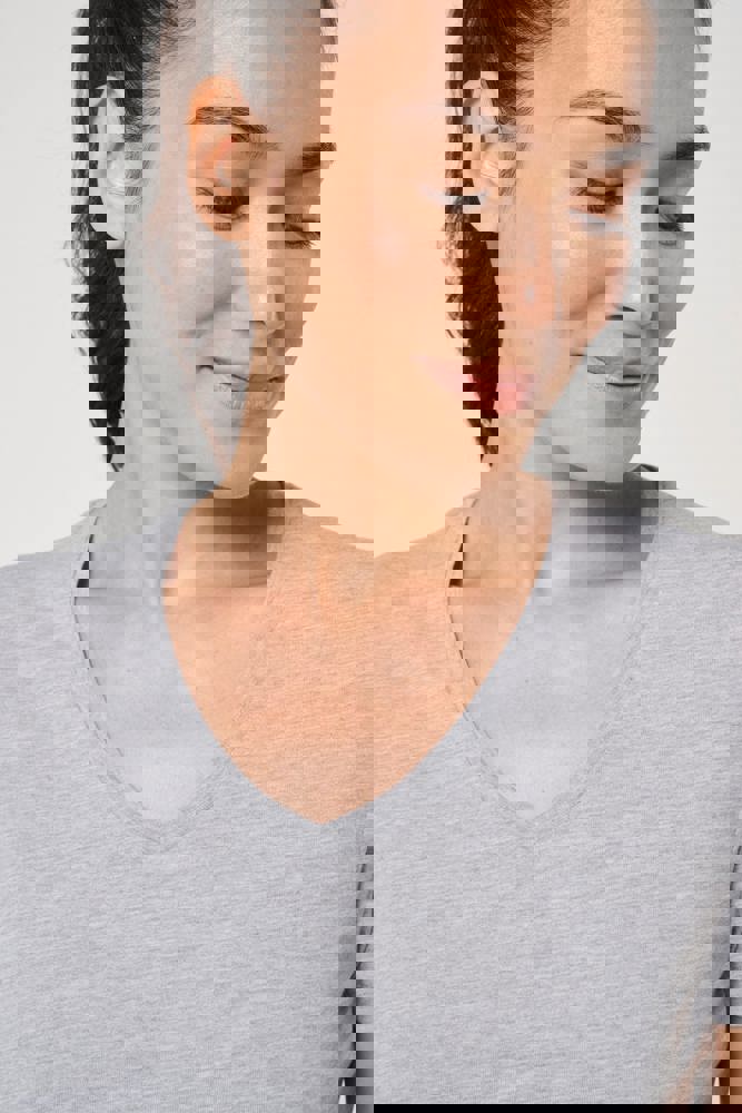 65% gerecycled polyester / 35% gekamd katoen. Jerseytricot, gebreid met VORTEX-garen om de vezel te verstevigen (tegen pluizen) voor de effen kleuren. Jerseytricot voor de kleur Oxford Grey. Enzymgewassen. Antibacteriële behandeling. Wasbaar op 60°C. Rechte snit. V-hals met 1x1 ribboord. Nektape in contrasterende jersey in de hals. Dubbel stiksel aan mouwuiteinden en onderkant. Afneembaar merklabel.