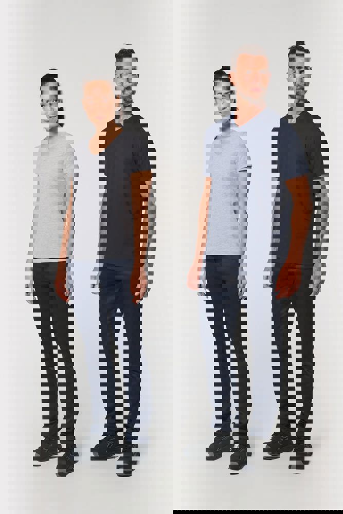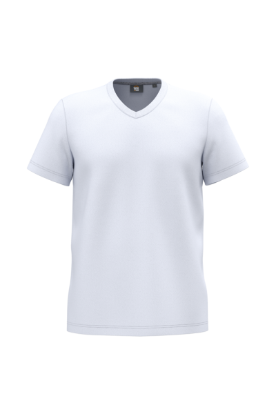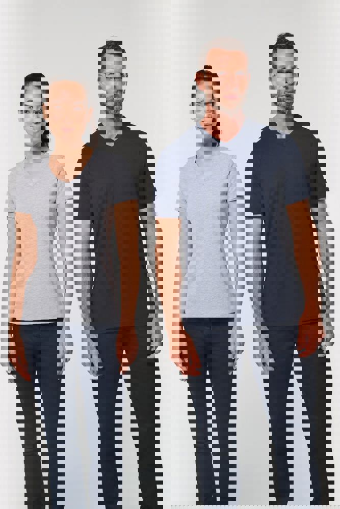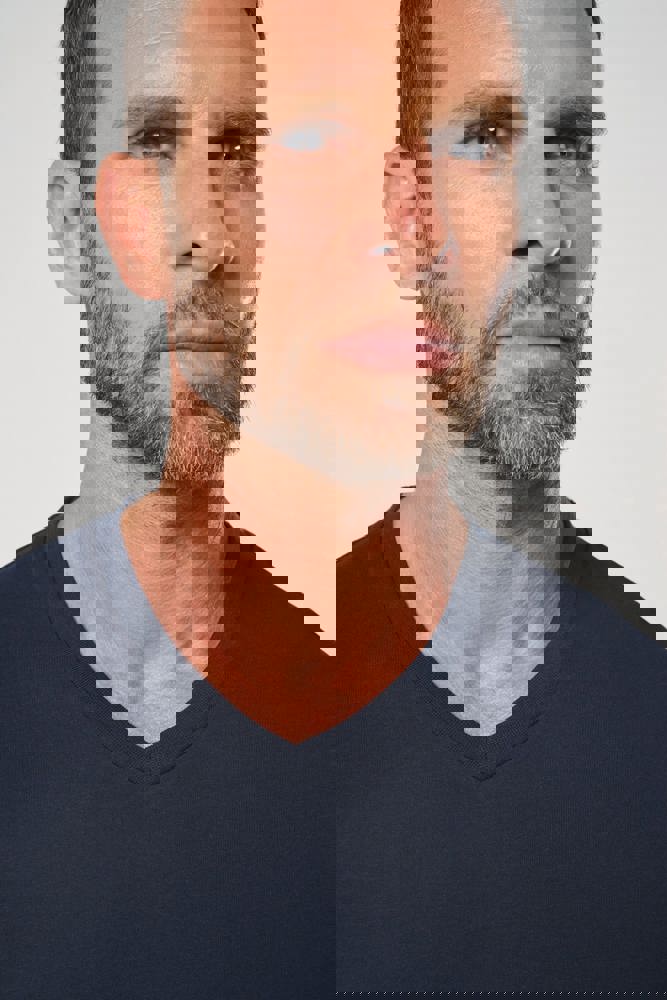 65% gerecycled polyester / 35% gekamd katoen. Jerseytricot, gebreid met VORTEX-garen om de vezel te verstevigen (tegen pluizen) voor de effen kleuren. Jerseytricot voor de kleur Oxford Grey. Enzymgewassen. Antibacteriële behandeling. Wasbaar op 60°C. Rechte snit. V-hals met 1x1 ribboord. Nektape in contrasterende jersey in de hals. Dubbel stiksel aan mouwuiteinden en onderkant. Afneembaar merklabel.