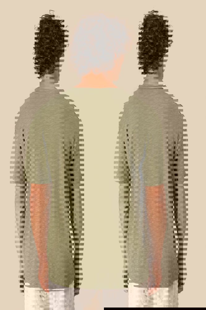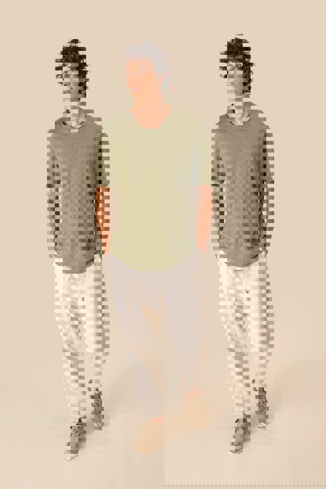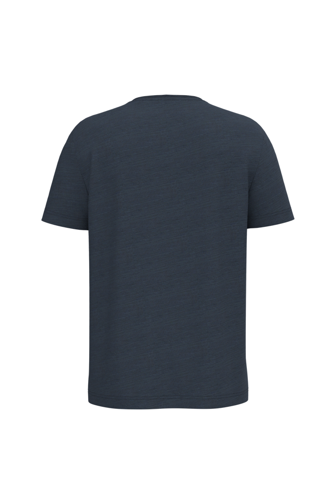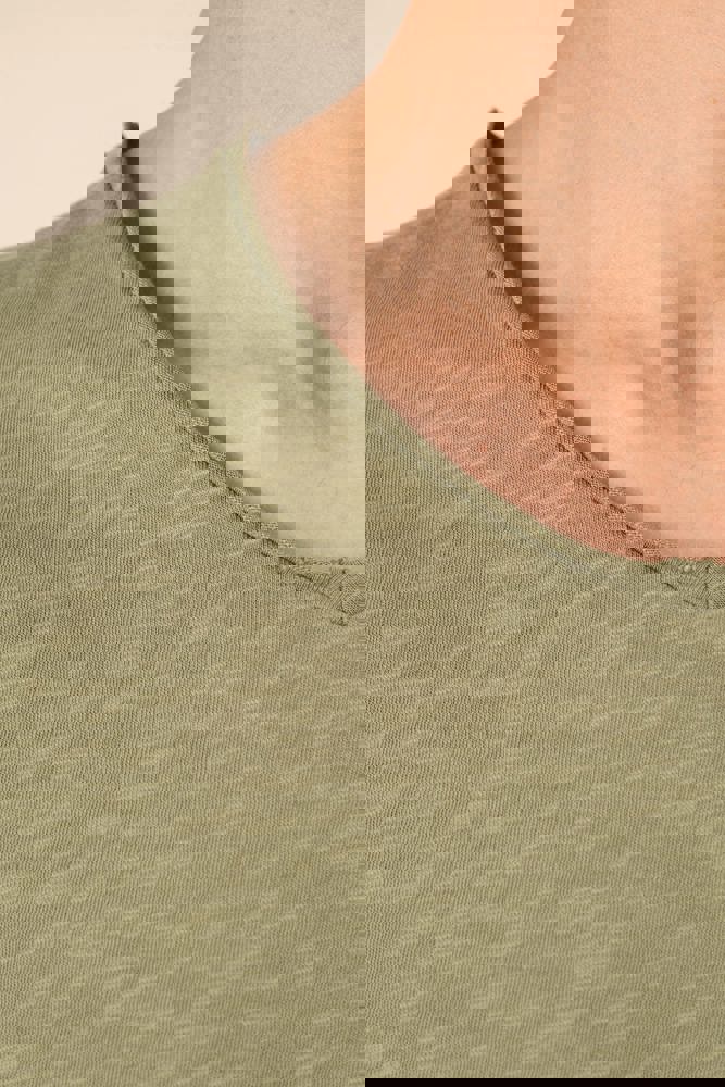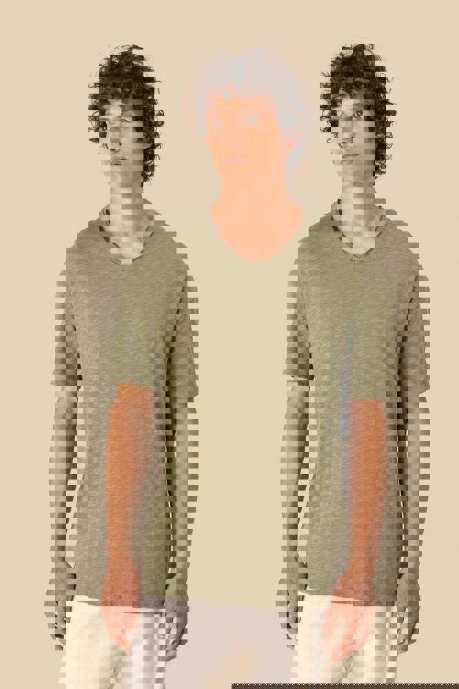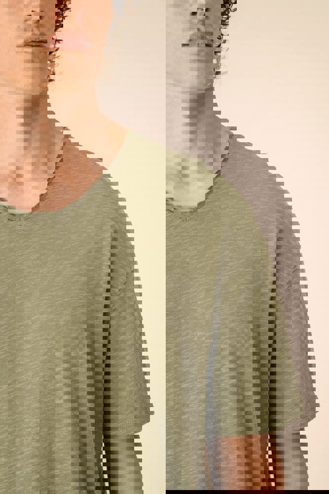 100% biologisch katoen. Gekamd katoen. Jerseytricot met gevlamd effect. Regular fit met afhangende schouders. Enzymgewassen. Zijnaden. V-hals met onafgewerkte boorden in de hoofdstof. Schouderversteviging. De hals is aan de binnenkant afgewerkt met ton-sur-ton nektape in de hoofdstof. Mouwuiteinden en onderkant met dubbel stiksel.