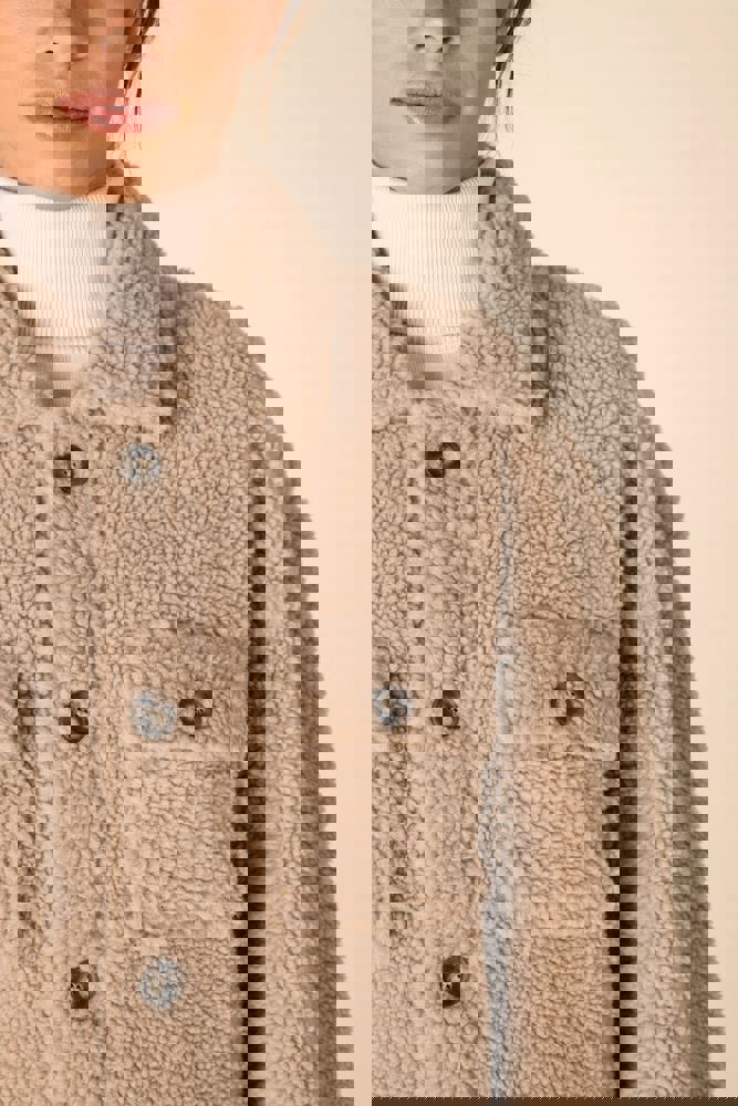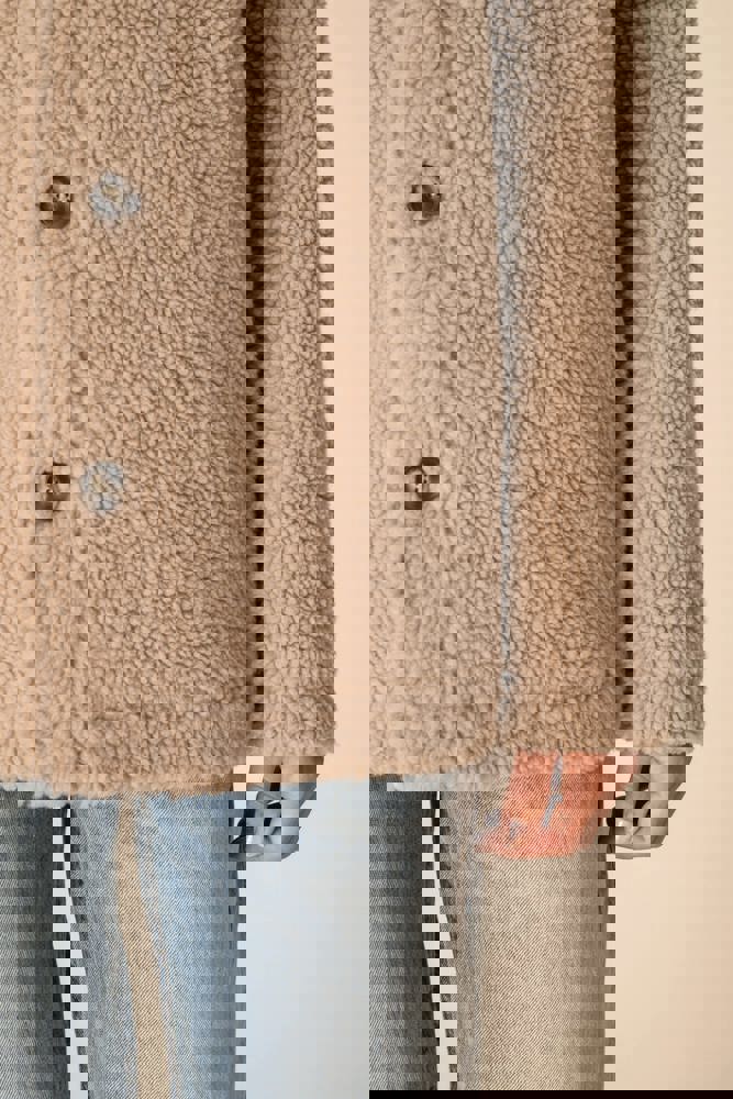 100% polyester. Regular fit met afhangende schouders. Sherpastof met voering van de body in jersey en voering van de mouwen in taffetas, voor makkelijk aantrekken. Kraag gevoerd met de hoofdstof. Knooplijst en borstzakjes met klep die sluiten met plastic knopen met hoornlook. De hals is binnenin afgewerkt met ton-sur-ton nektape met kepermotief. De mouwuiteinden en de zoom zijn afgewerkt met enkel stiksel. Drukkersrits aan de binnenkant onderaan.