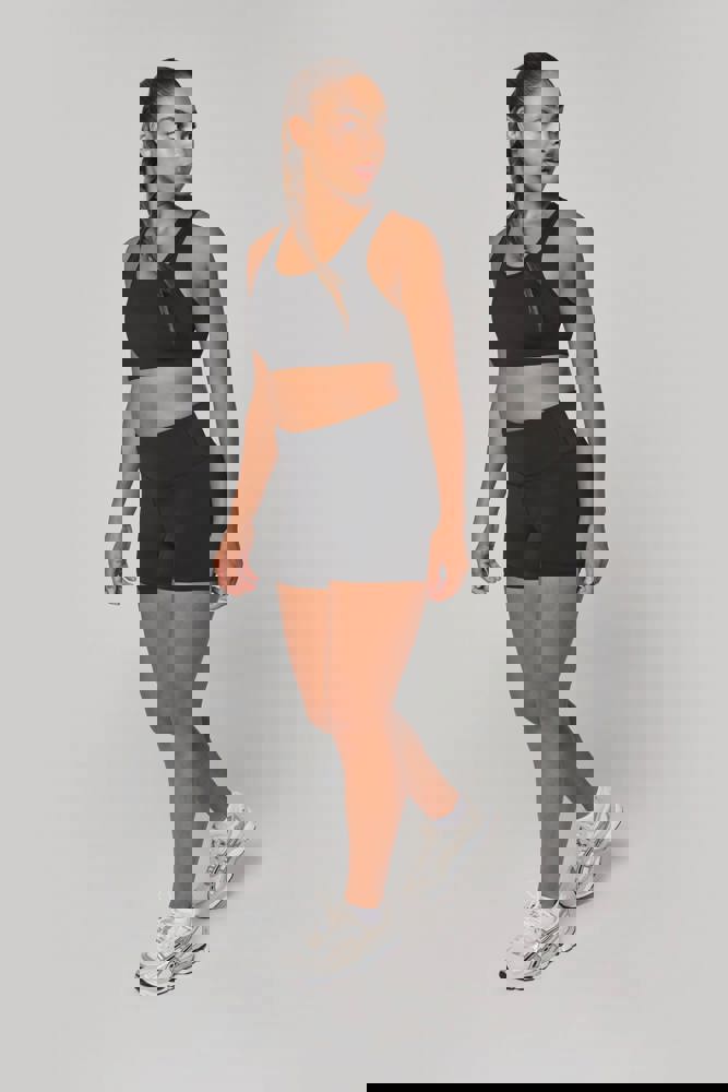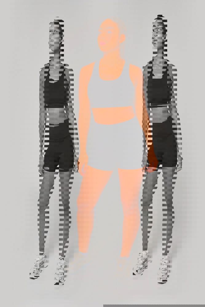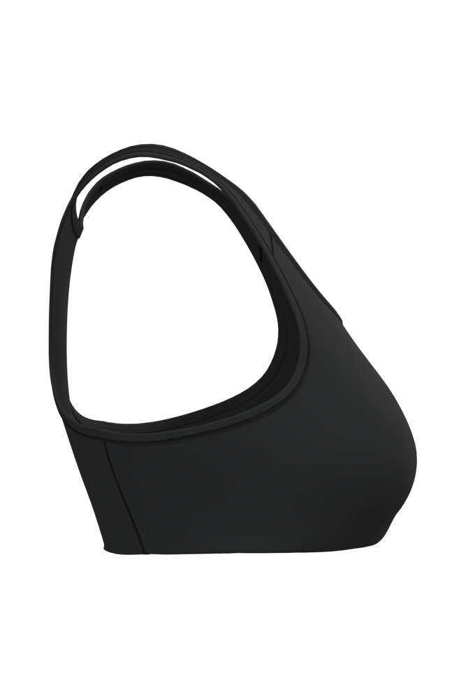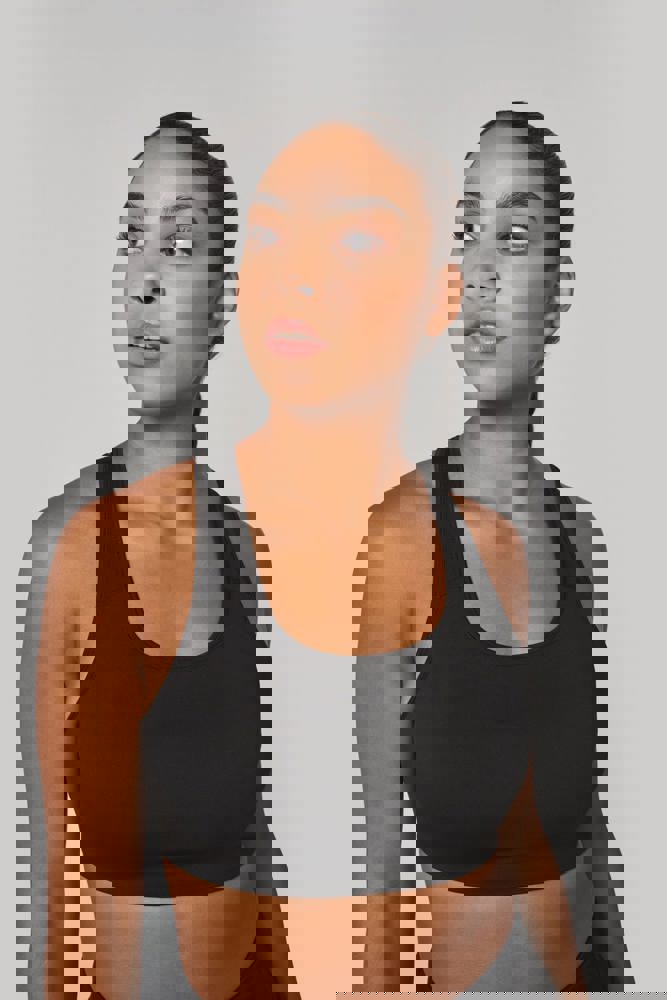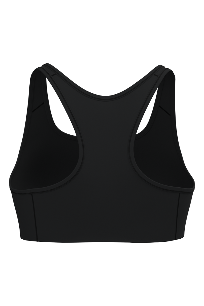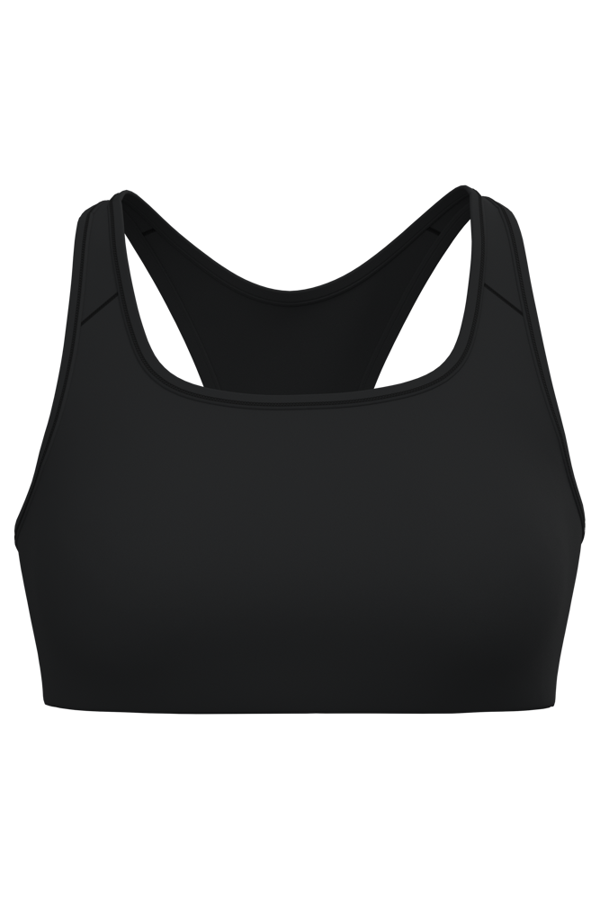 81% gerecycled polyester / 19% elasthan. Wasbaar op 40°C. Racerback. Ronde halsopening met uitneembare cup. Ton-sur-ton biesje aan hals, mouwopeningen en rug. Elastische ondersteuning onder de borst. No label.