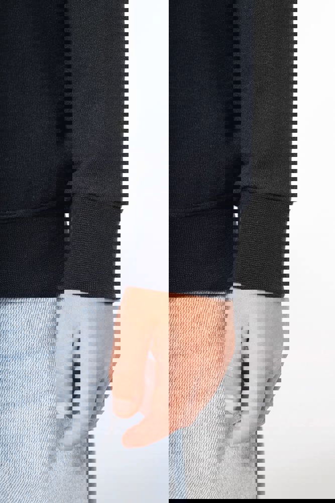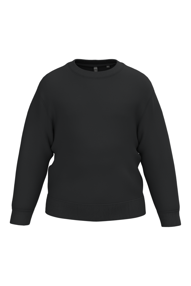 50% ringgesponnen katoen / 50% post-consumer gerecycled polyester. Geborsteld fleece aan de binnenkant. Straight snit. Cut-and-sew. Enzymgewassen. 2x1 ribboord in buisconstructie voor een betere afwerking aan hals, mouwuiteinden en onderkant. Dubbel stiksel aan schouders, mouwinzet, mouwuiteinden en onderaan. Ton-sur-ton nektape van jersey in de hals. Geen merklabel, maar een maatlabel in de kraag voor eenvoudige personalisatie.