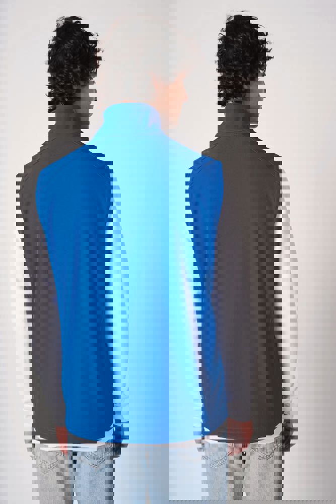 95% polyester / 5% elastaan. Softshell 2 lagen met waterafstotende behandeling. Binnenkant: zwarte micropolar van 100% polyester. Rechte snit. Twee zijzakken met polytricot voering, nylonritsen en zwarte ritstrekkers. Ritssluiting in zwart nylon met kinbescherming en ritstrekker. Schouder- en rugstukken met sierstiksels. Zwarte nektape aan de binnenzijde. Armsgaten en zoom afgewerkt met dubbele stiksels. Afneembaar merklabel.