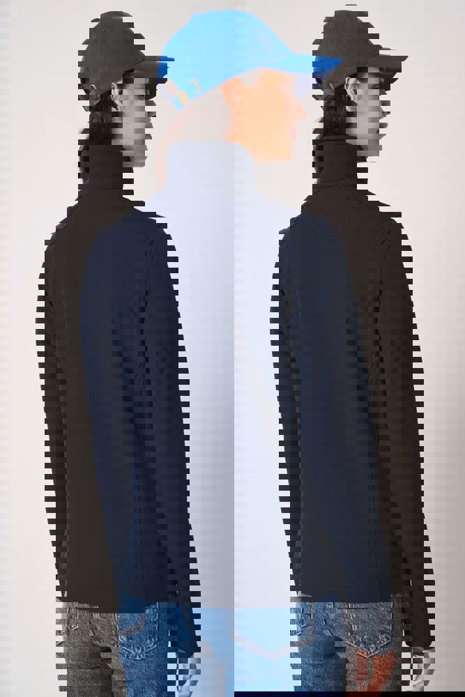 95% polyester / 5% elastaan. Softshell 2 lagen met waterafstotende behandeling. Binnenkant: zwarte micropolar van 100% polyester. Rechte snit. Twee zijzakken met polytricot voering, nylonritsen en zwarte ritstrekkers. Ritssluiting in zwart nylon met kinbescherming en ritstrekker. Schouder- en rugstukken met sierstiksels. Zwarte nektape aan de binnenzijde. Mouwboorden en zoom afgewerkt met dubbele stiksels. Afneembaar merklabel.