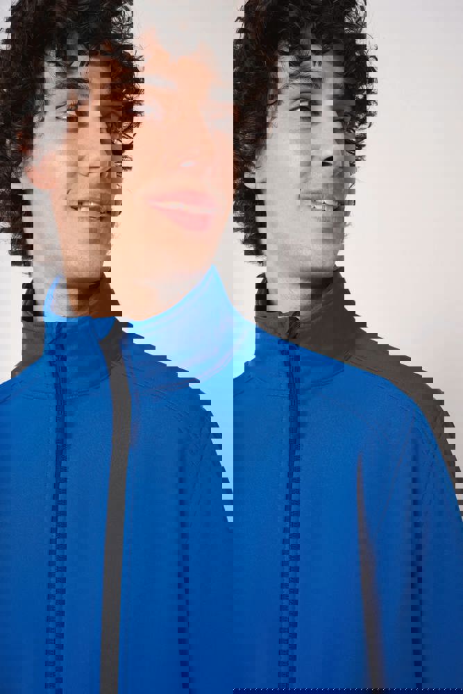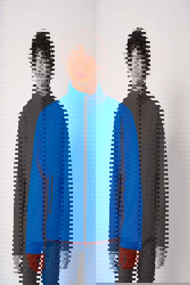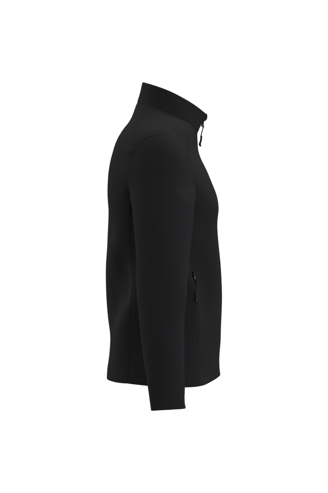 95% polyester / 5% elastaan. Softshell 2 lagen met waterafstotende behandeling. Binnenkant: zwarte microfleece van 100% polyester. Rechte snit. Opstaande kraag. Twee zijzakken met polytricot voering, nylonritsen en zwarte ritstrekkers. Ritssluiting in zwart nylon met kinbescherming en ritstrekker. Schouder- en rugstukken met sierstiksels. Zwarte nektape aan de binnenzijde. Mouwboorden en zoom afgwerkt met dubbele stiksels. Afneembaar merklabel.