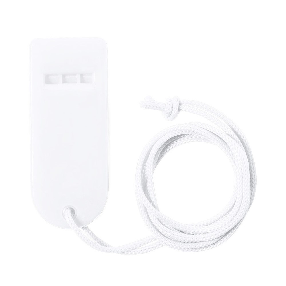 Fluitje met opvallend design en gemaakt van duurzaam PS. Met bijpassende kleur halskoord en verkrijgbaar in een groot aantal kleuren.