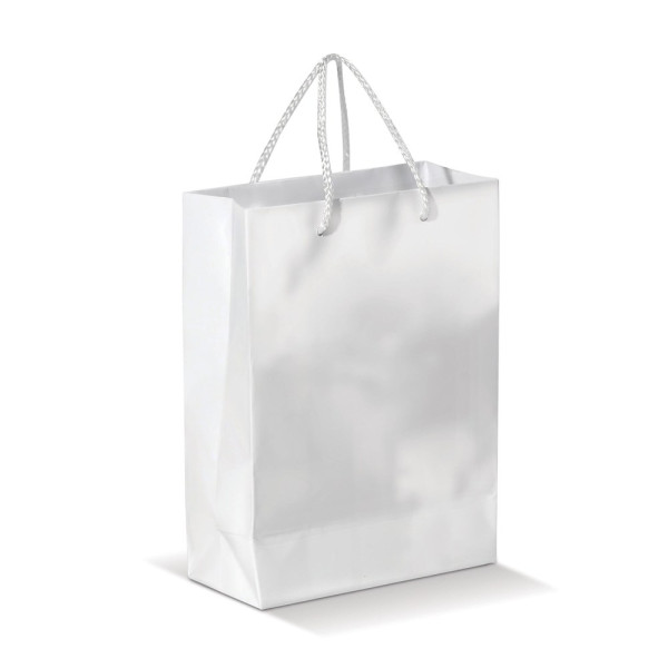 Grote papieren tas met hengels van gevlochten touw in wit en zwart. Groot drukoppervlak aan beide zijden. Stevige tas. Glossy gelamineerd.