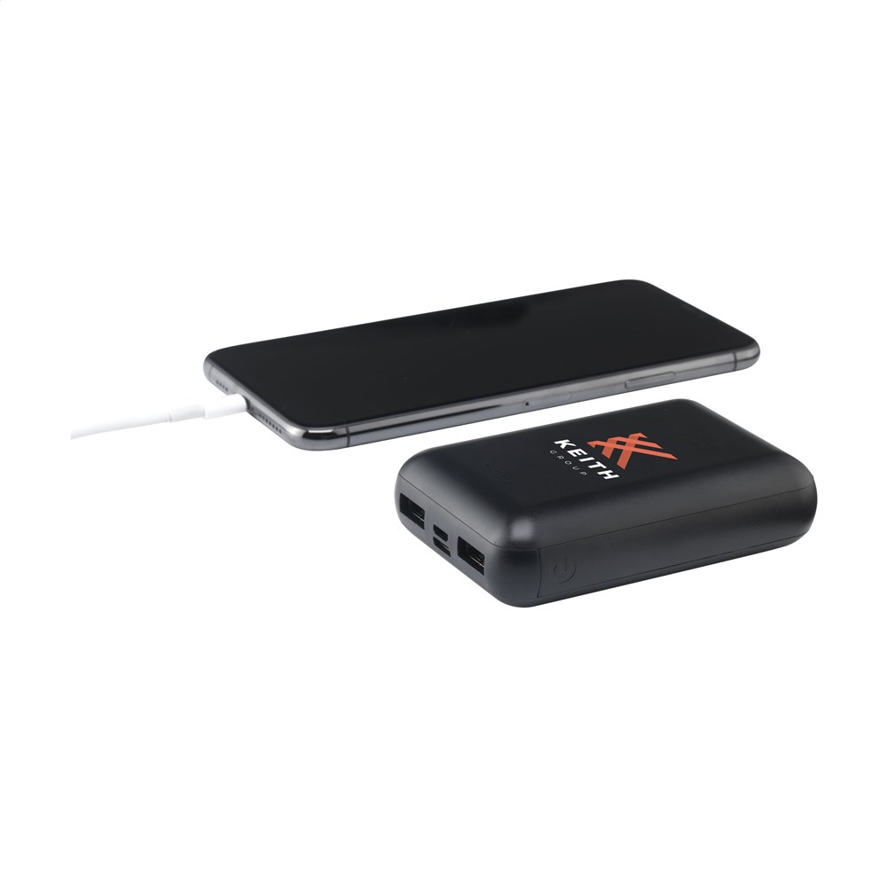 Kleine, lichte en zeer krachtige wireless charging (5W) powerbank van gerecycled ABS met ingebouwde lithium-polymeerbatterij (10.000 mAh). Deze krachtpatser past gemakkelijk in je broekzak waardoor je hem comfortabel overal mee naar toe kunt nemen. Ondanks het geringe formaat draag je genoeg power met je mee om je telefoon veelvuldig op te laden via de 2 USB poorten of de geïntegreerde 5W wireless laadfunctionaliteit (ondersteunt draadloos opladen van mobiele apparaten die QI draadloos laden ondersteunen). Input 5V/2A. 2x Output: 5V/2A. Draadloze output: 5W. Met indicatielampjes en aan/uit knop. Inclusief oplaadkabel USB-C naar USB-C en gebruiksaanwijzing. Per stuk verpakt.