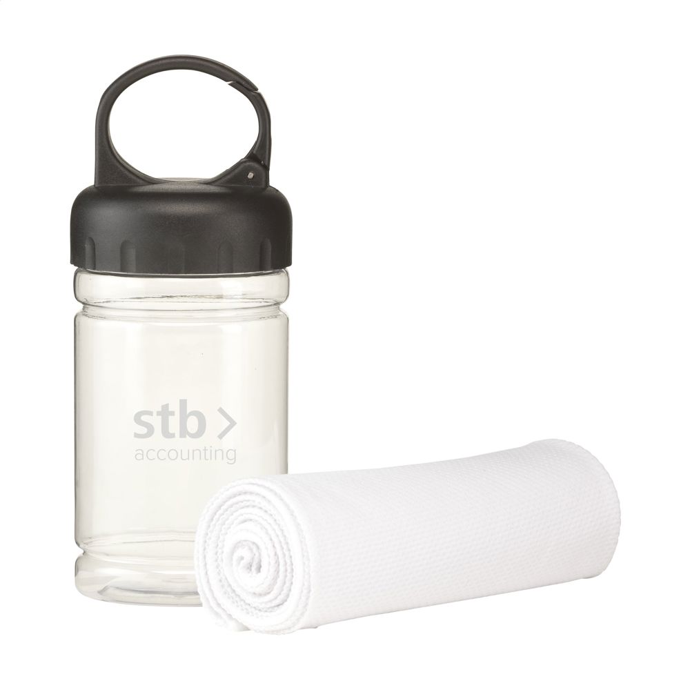 Speciale koelhanddoek van 100% polyester. Na een dompeling in koud water biedt deze handdoek verkoeling tijdens sportieve activiteiten of bij zonverbranding. Ideaal formaat (afm. 30 x 80 cm) om te dragen als nekkoeler. In transparante koker met ABS schroefdeksel met karabijnhaak.