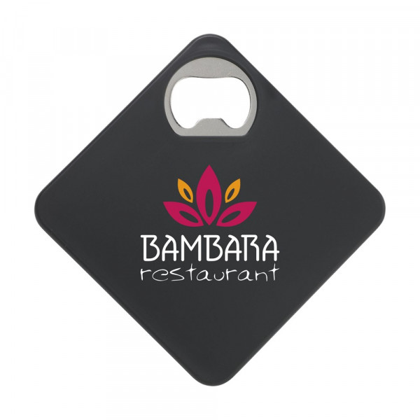 Onderzetter en metalen opener in één. Met slipvaste onderzijde. Ook te bedrukken met je eigen foto, logo of zelfontworpen design in full colour. Ideaal om te verzenden als brievenbusgeschenk.