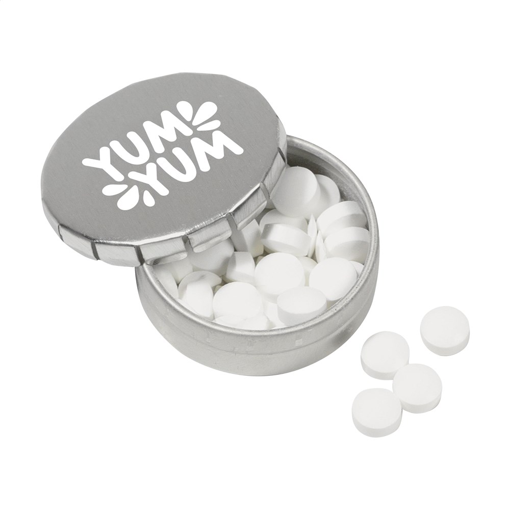 Uitdeelblikje met handig druk-/kliksysteem. Gevuld met ca. 12 g snoepjes.