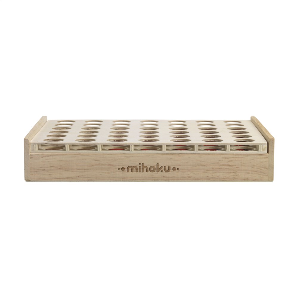 Strategisch spel geschikt voor 2 spelers. Deze compacte versie is gemaakt van FSC 100% gecertificeerd polyhout en multiplex en wordt geleverd met 21 stenen in de kleuren rood en blauw. Met een handige draaifunctie om het frame rechtop te zetten. Wie het eerst 4 stenen van dezelfde kleur horizontaal, verticaal of diagonaal op een rij zet, is de winnaar. Een spel voor jong en oud. Inclusief spelregels. Per stuk verpakt.